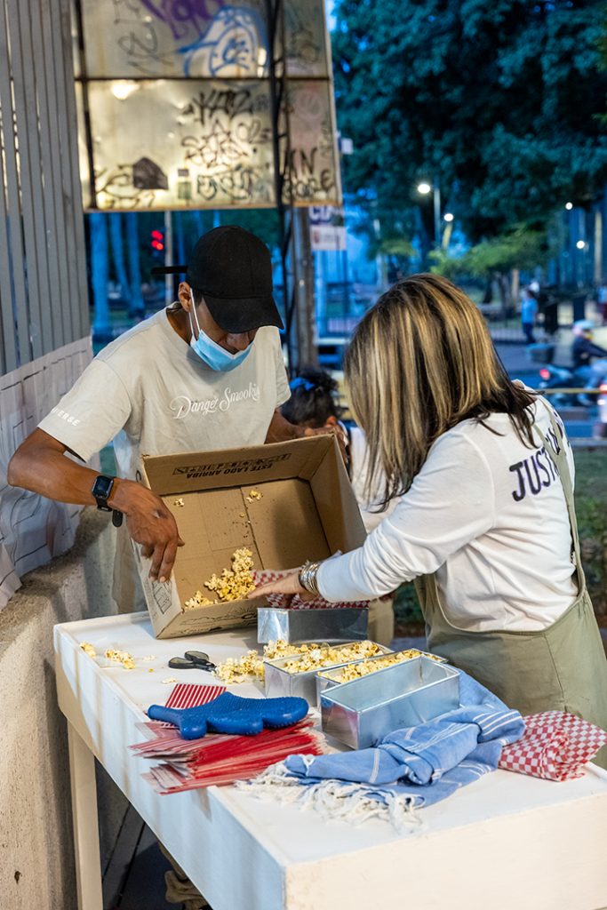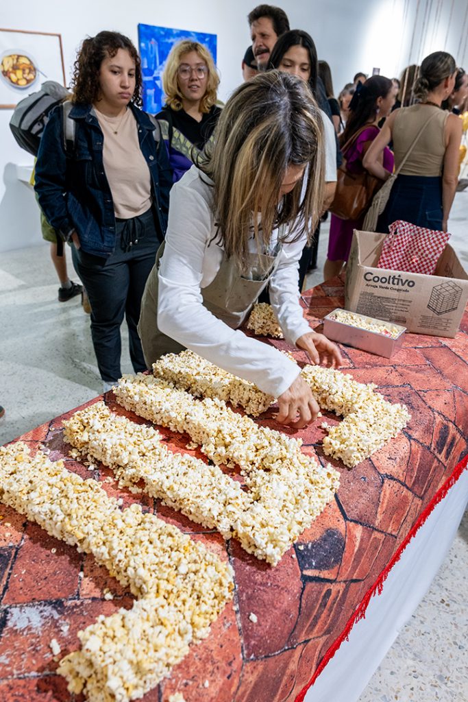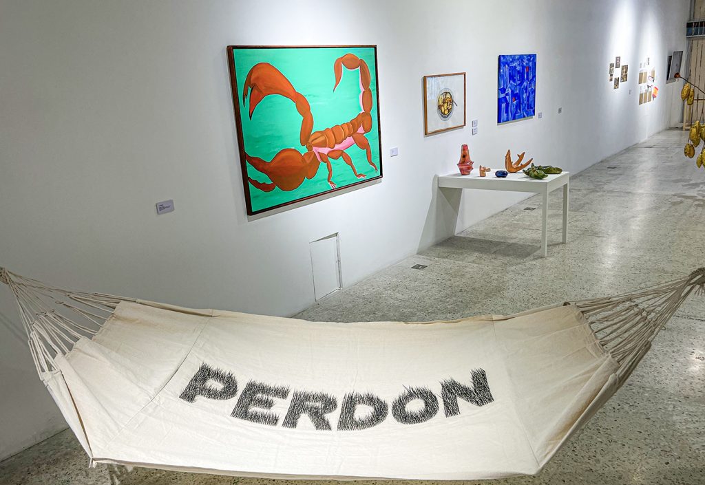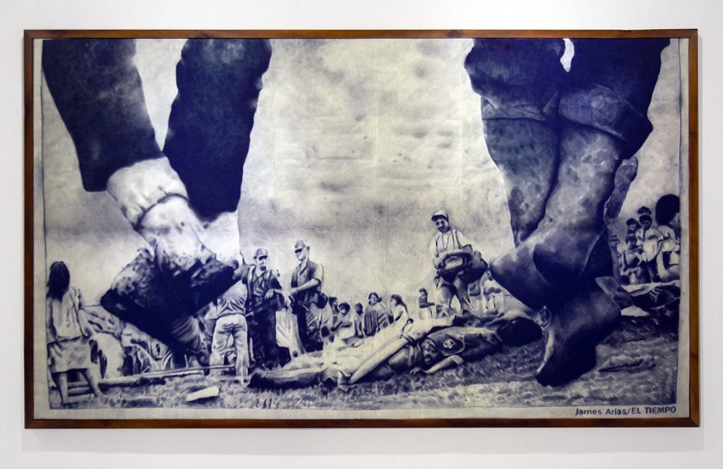 Paradójicamente, desde ese mismo rasgo, se normalizan también desigualdades. En Justicia POP (2010–2025), Alejandra Rodríguez llevó un carro de crispetas y fue construyendo la palabra “justicia” mientras las personas las comían. Un acto interminable en el que se vuelve cotidiano que nada se logre, que la justicia aplique solo para algunxs y deje relegadas a las comunidades que esperan. En esa misma sala, la obra Caternarias, de Ángela Villegas, intervino el espacio con una hamaca atravesada por espinas de chonta y la palabra «perdón». Frente a ella, como un coro que se va creando, la pieza de Angélica Castro, Proceso para la memoria (dibujo azul) (2021–2023), establece el diálogo entre la historia y el peso de las masacres en esta nación. En ella, vemos la parte posterior de unos pies, en perspectiva, que, sobre una cerca de madera, contemplan un campo de cuerpxs muertxs. La escena plantea una relación donde la vida se carga como una potencia, como algo que aún respira incluso desde el dolor. Ese tránsito sugiere un sentir que va desde la experiencia corporal hasta la conciencia territorial, revelando en cada gesto una comprensión del arte como práctica situada y relacional, permitiendo que la exposición funcionara como un dispositivo de desaprendizaje.