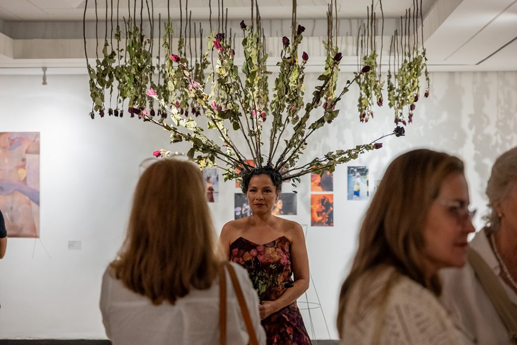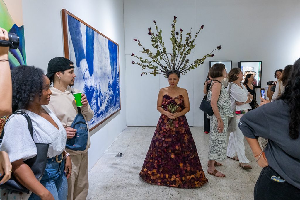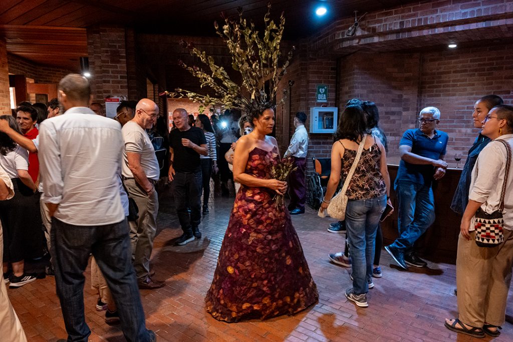 Este proceso relacional dio forma a una construcción simple pero potente en la obra de JohnaJohn Campo, Tejer con espumas un refugio entrañable (2025). Mediante trozos de espuma que se van juntando en una red por la acción colaborativa del público, Campo retoma la experiencia dxl cuerpx en el mundo drag, donde este material tiene múltiples usos, generando una interconexión de historias que dan forma a un todo común en la existencia plural de las identidades. Esta posibilidad de invención evoca la memoria del cuerpx como espacio de fuga y, a su vez, como territorio en disputa. La activación del performance de Janeth Blanco, Dulces gotas (1997–2025)[2], coloca en tensión esta relación al mostrarse coronada por rosas que se mantienen verticales sobre su cabeza, bañándola con sutileza bajo el peso de los símbolos de belleza y sacrificio. En su lento andar, como soportando las espinas, vestida con un traje hecho de pétalos de esta misma flor, mantiene un gesto solemne, metáfora viva de que toda transformación política comienza en la piel y en el gesto.