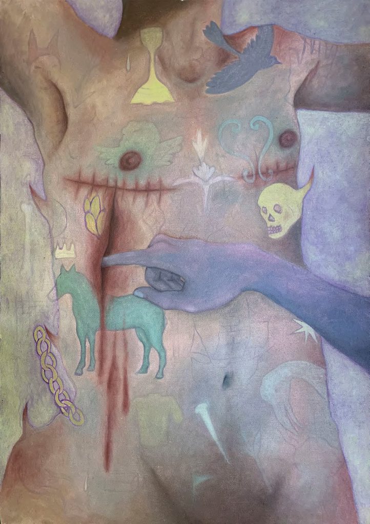 La pintura de Saro Pachón, Justo en la herida (2024), interpela con la potencia de la honestidad un cuerpx autorrepresentadx, que supera la imagen para ahondar en el primer espacio vital que le contiene. Desde este, franquea el archivo de la historia, en el que: “La relación entre cuerpo y sujeto está atravesada por el poder y las formas del mismo que intentan cuerpos vinculados a los ‘tipos’ de sujetos que se privilegia en una sociedad,”[1] para llegar a la ruptura desde la desobediencia, manifestada no en lo que se muestra, sino en el cómo: en el gesto de no ofrecer imágenes dóciles, en la insistencia de ocupar un espacio con formas incómodas, inacabadas, desmantelando las ficciones que separan une humane de otrx.