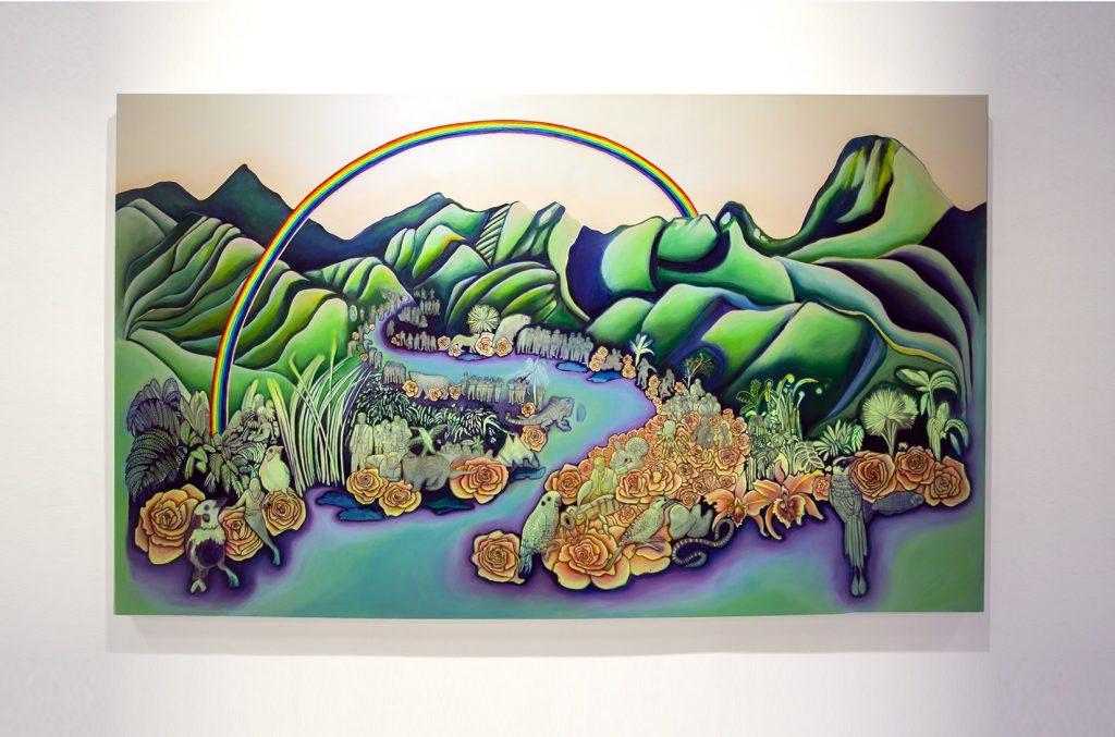 Izquierda: Río Nuevo. Ana María Velasco. 2,50 m x 1,50 m. Acrílico sobre lienzo. 2025
