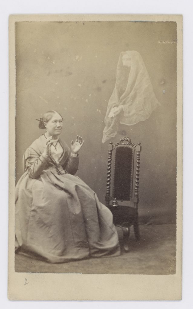 Frederick Hudson Georgiana Houghton con un espíritu, ca. 1874. Tiraje a la albúmina montado sobre cartón, 10.4 × 6.3 cm. Institut für Grenzgebiete der Psychologie und Psychohygiene, Freiburg i. Br. Foto: Institut für Grenzgebiete der Psychologie und Psychohygiene.