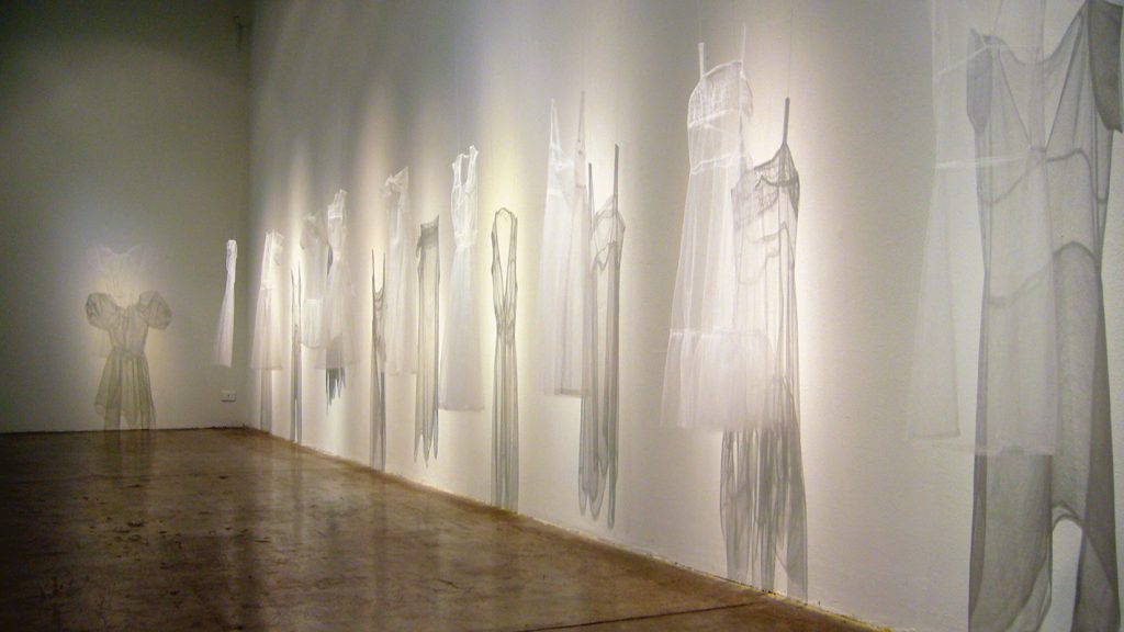 Claudia Casarino. Desvestidos, 2005. Ocho vestidos de tul, dimensiones variables. Colección de la artista. Foto: Claudia Casarino.