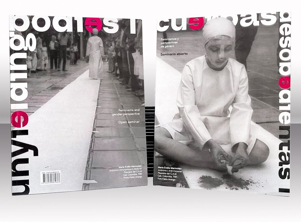 Portada del libro – Ediciones en inglés y en español. Imágenes de portada: María Evelia Marmolejo, Anónimo 1, Arte corporal, Plazoleta del C.A.M., Cali, Colombia, 1981. Fotografía: Fabio Arango. Cortesía de la artista