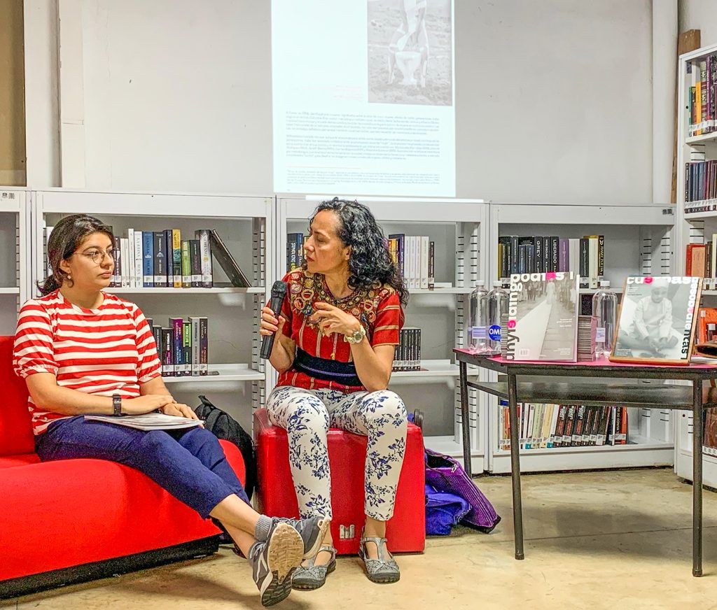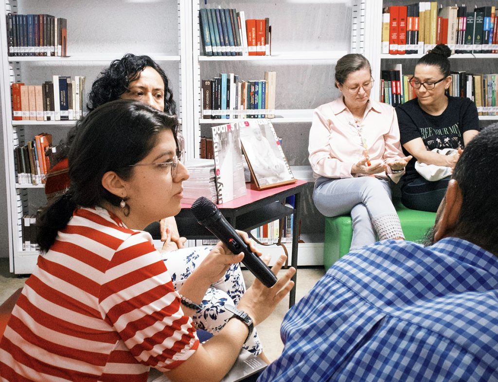 De izquierda a derecha: Dayana Camacho, María del Pilar Vergel, Vivian Monsalve, Saro Pachón y Connie Gutiérrez — artistas y académicas presentes en el libro. Yohanna M. Roa, editora de la publicación, durante el lanzamiento de Cuerpas Desobedientas