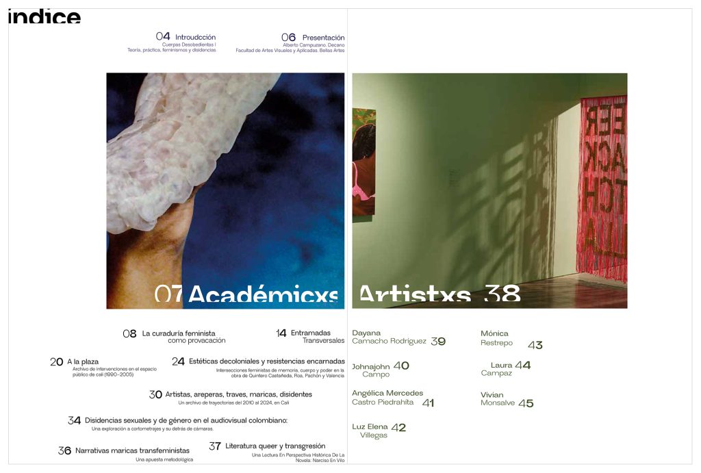 Entre las personas colaboradoras se encuentran académicas como Karen Cordero Reiman, quien analiza la curaduría feminista como una herramienta política; María del Pilar Vergel, quien reflexiona sobre cómo las artistas feministas han utilizado sus cuerpos como herramientas de resistencia frente a las estructuras coloniales y patriarcales; y Leandra Plaza, quien presenta un archivo de artistas lesbianas y disidentes en Cali. También participan colectivos como Viraje y A la Plaza, que recuperan intervenciones en el espacio público como actos de reescritura del territorio y de la memoria local.
