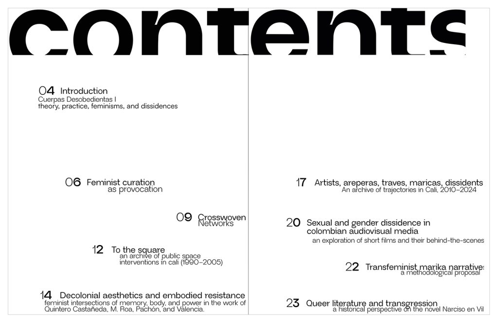 Contributors include scholars such as Karen Cordero Reiman, who explores feminist curating as a political tool; María del Pilar Vergel, who reflects on how feminist artists have used their bodies as tools of resistance against colonial and patriarchal structures. Leandra Plaza, who presents an archive of lesbian and dissident artists in Cali, and collectives like Viraje and A la Plaza, who recover public space interventions as acts of rewriting both territory and local memory.