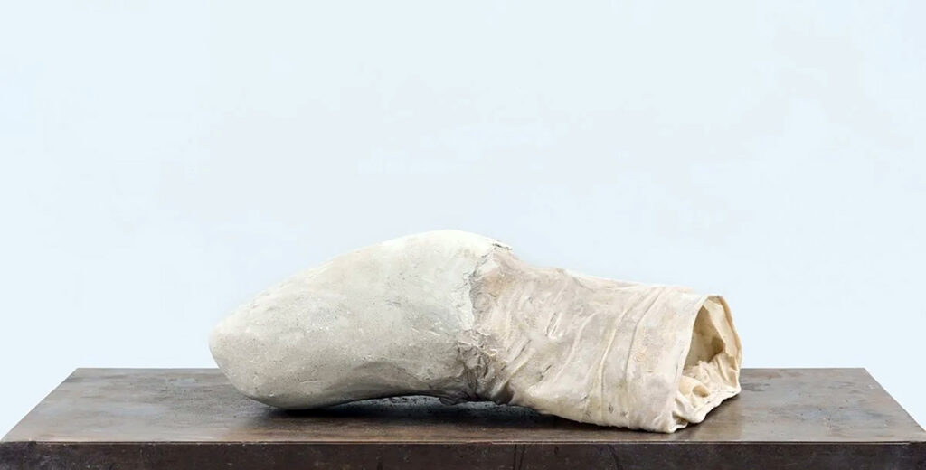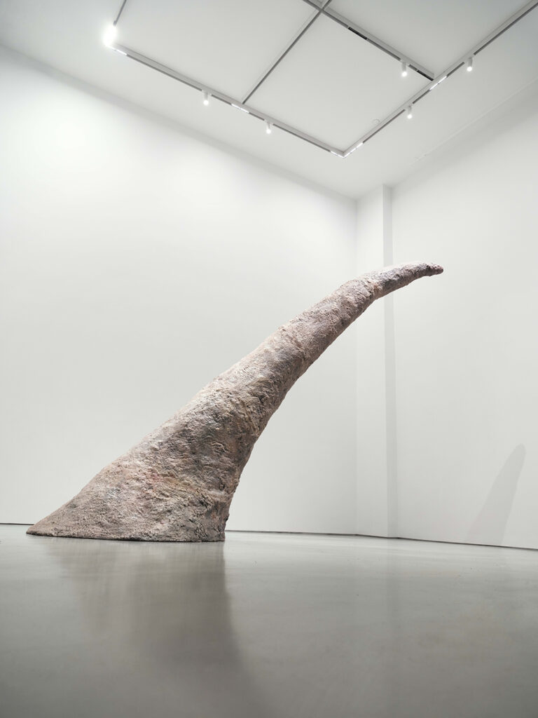 From the entrance, a smaller-scale sculpture, yet one of great power ( Sac 2019), made of concrete, flannel, and resin, rests on a white shelf without truly resting upon it. It vibrates. It resembles a suspended fragment of flesh, latent, as if on the verge of being activated or of rising at any moment. It is not a closed form, but a body in waiting. Further along, a corridor unfolds like an epidermal passage: paintings and drawings of phallic forms, some conical, others oblique, accompany the viewer’s movement as a sequence of skins, organs, soft obelisks. At the far end, two monumental sculptures (Conical and Heat, 1981), in concrete and encaustic, rise semi-inclined and pointed, gesturing upward toward a space that no longer belongs to the human body.