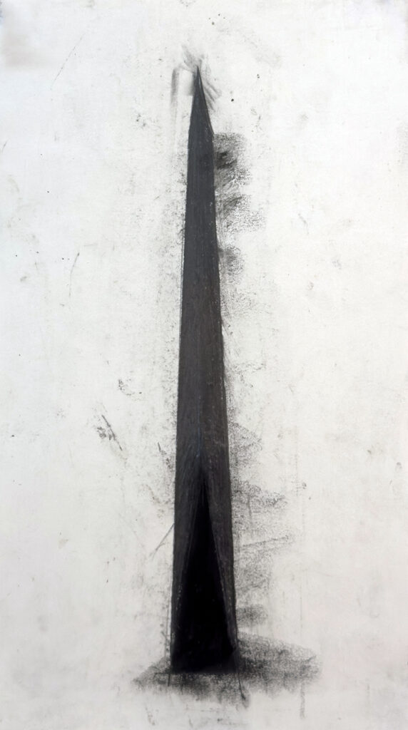 Sor Juana reminds us that these obelisks, however high they rise, belong to the human rather than the divine. They are forms born of the earth. In the same way, Mia’s sculptures point skyward with contained violence, their tips seeming to tear through the ceiling and compel us to lift our gaze. There is in them an unmistakable ambition: the desire for absolute knowledge, for totality, for going beyond the body. “Seeking to scale the stars,” Sor Juana writes. But the poem is clear: the ascent fails. Understanding grows weary, fails to reach even the lunar orbit, and retreats.