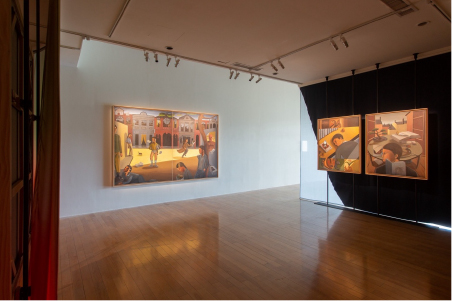 Ironically, in an exhibition some observers have characterized as apolitical, yearning resonates most powerfully in works that confront historical rupture. Korakrit Arunanondchai’s Love after Death (2025), set in an abandoned factory in Lopburi, Thailand—now inhabited by monkeys believed to embody ancestral spirits—articulates this tension with conviction. The film’s invocation “not let the past disappear” and to move “beyond the threat of the modern world” frames yearning not as nostalgia but as insistence.[6] Projected on a monumental screen before a ruin-like backdrop intermittently illuminated by flickering light, the installation underscores the Biennial’s strength in spatial dramaturgy. Upstairs, Skyler Chen’s recent paintings interrogate the intersection of queer history and Taiwan’s own past by reintroducing queer presence into scenes drawn from the Martial Law period (1949–1987). Through saturated chromatic intensity, anachronistic and at times deliberately provocative iconographies, and muted Balthus-esque figures, Chen’s canvases engage oppression and liberation with greater thematic coherence than the exhibition’s introductory framing devices.